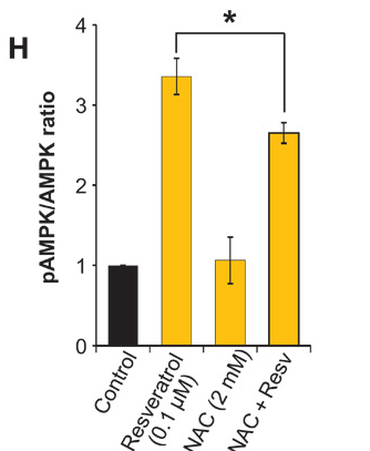 Many of these NEBCs are broadly called antioxidants and have been suggested to reduce oxidative stress, and DNA damage. However, this mode of action has been highly critiqued, as low levels of oxidative stress might be beneficial and certainly serve as potent intracellular signals. The authors observed an increase in ROS species within an hour of resveratrol treatment, and followed up with a co-culture experiment where cells cultured with resveratrol were also cultured with a potent antioxidant, n-acetylcysteine (NAC). One can see below that this blunted the effect of resveratrol, suggesting that resveratrol is not acting through an antioxidant effect but rather as a pro-oxidant.